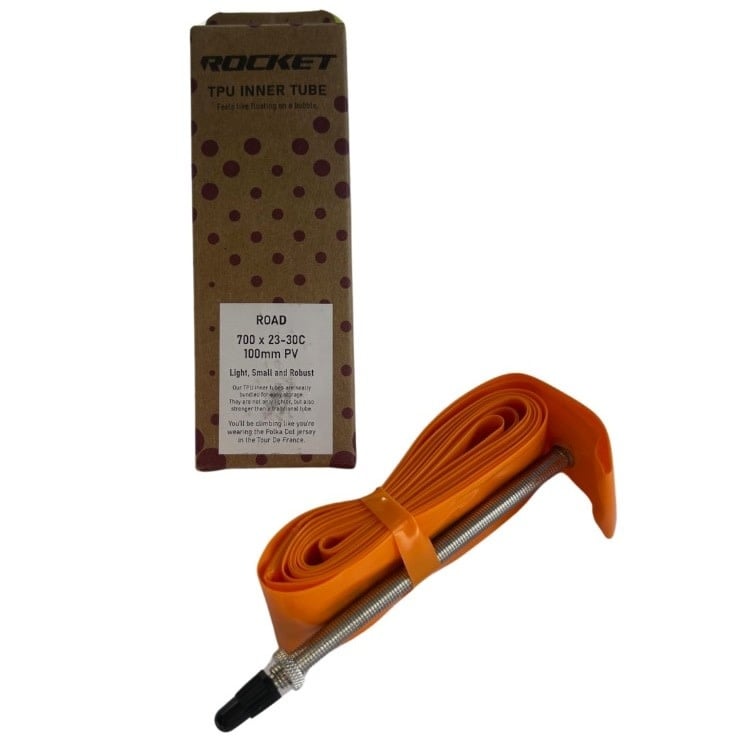 When installing a Rocket TPU tube, use a small amount of talcum powder or ensure the inside of the tire is clean. Because TPU is so thin, it is easier to "pinch" during installation compared to thick rubber. Always hand-seat the last section of the tire bead rather than using levers to avoid snagging the tube. For riders using very deep rims, the 100mm valve ensures enough clearance to fit almost any track or floor pump head comfortably.